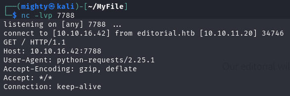 ┌──(mighty㉿kali)-[~] └─$ sudo nmap -sV -Pn -A -p22,80 10.10.11.20 PORT STATE SERVICE VERSION 22/tcp open ssh OpenSSH 8.9p1 Ubuntu 3ubuntu0.7 (Ubuntu Linux; protocol 2.0) | ssh-hostkey: | 256 0d:ed:b2:9c:e2:53:fb:d4:c8:c1:19:6e:75:80:d8:64 (ECDSA) |_ 256 0f:b9:a7:51:0e:00:d5:7b:5b:7c:5f:bf:2b:ed:53:a0 (ED25519) 80/tcp open http nginx 1.18.0 (Ubuntu) |_http-server-header: nginx/1.18.0 (Ubuntu) |_http-title: Did not follow redirect to http://editorial.htb
