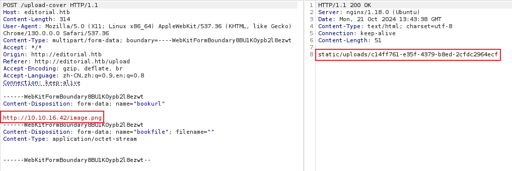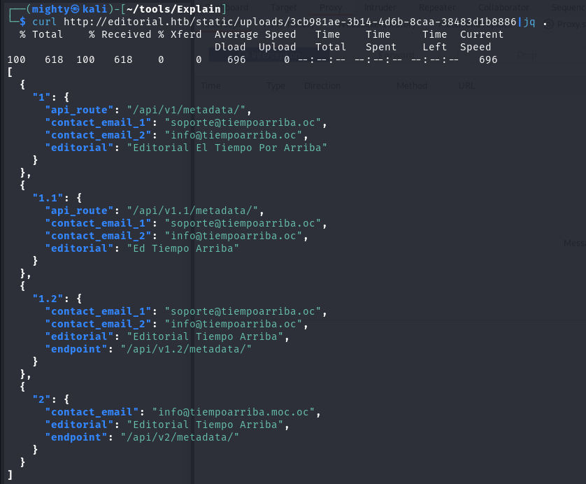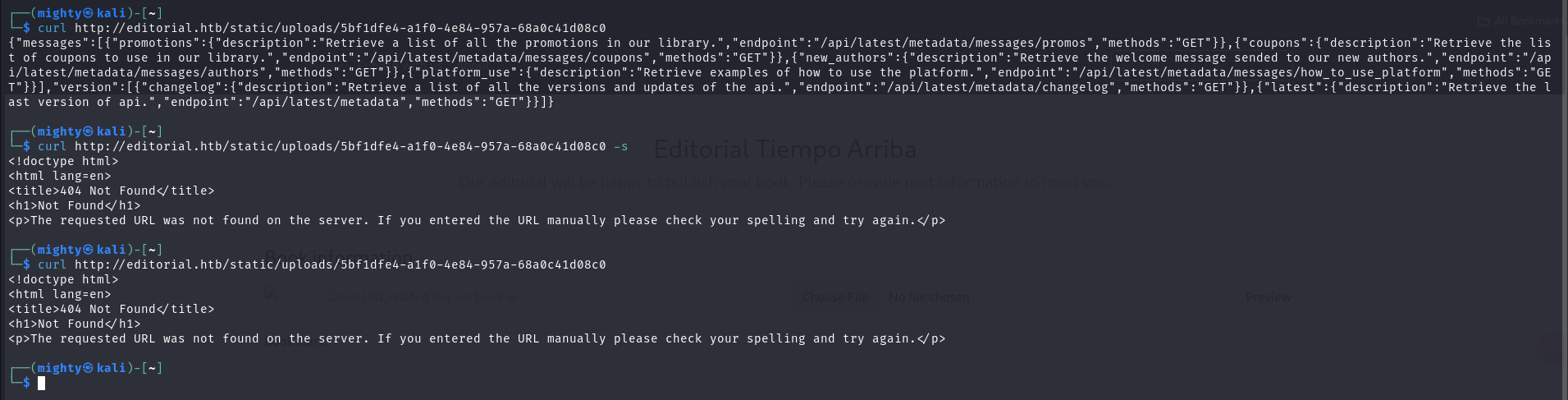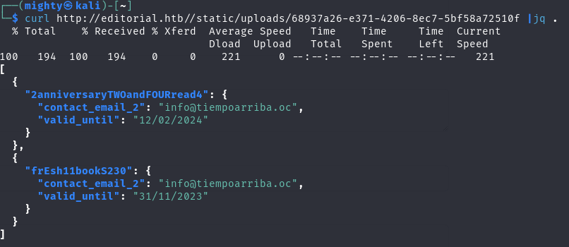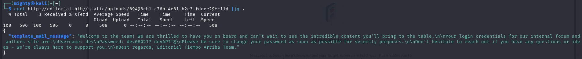 dev@editorial:~/apps$ git diff 1e84a03 b73481b diff --git a/app_api/app.py b/app_api/app.py index 61b786f..3373b14 100644 --- a/app_api/app.py +++ b/app_api/app.py @@ -64,7 +64,7 @@ def index(): @app.route(api_route + '/authors/message', methods=['GET']) def api_mail_new_authors(): return jsonify({ - 'template_mail_message': "Welcome to the team! We are thrilled to have you on board and can't wait to see the incredible content you'll bring to the table.\n\nYour login credentials for our internal forum and authors site are:\nUsername: prod\nPassword: 080217_Producti0n_2023!@\nPlease be sure to change your password as soon as possible for security purposes.\n\nDon't hesitate to reach out if you have any questions or ideas - we're always here to support you.\n\nBest regards, " + api_editorial_name + " Team." + 'template_mail_message': "Welcome to the team! We are thrilled to have you on board and can't wait to see the incredible content you'll bring to the table.\n\nYour login credentials for our internal forum and authors site are:\nUsername: dev\nPassword: dev080217_devAPI!@\nPlease be sure to change your password as soon as possible for security purposes.\n\nDon't hesitate to reach out if you have any questions or ideas - we're always here to support you.\n\nBest regards, " + api_editorial_name + " Team." }) # TODO: replace dev credentials when checks pass # -------------------------------