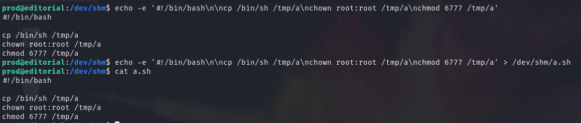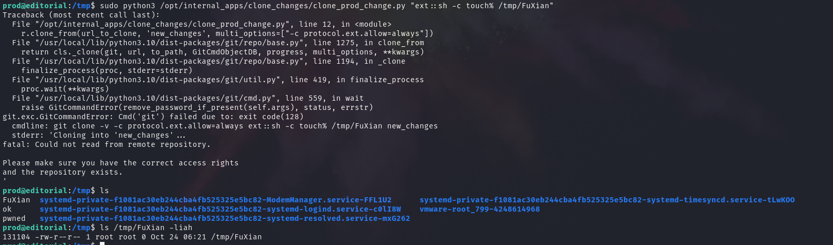 dev@editorial:~$ cd /home dev@editorial:/home$ ls dev prod dev@editorial:/home$ ls -liah total 16K 76438 drwxr-xr-x 4 root root 4.0K Jun 5 14:36 . 2 drwxr-xr-x 18 root root 4.0K Jun 5 14:54 .. 79764 drwxr-x--- 4 dev dev 4.0K Oct 22 06:52 dev 77643 drwxr-x--- 5 prod prod 4.0K Jun 5 14:36 prod