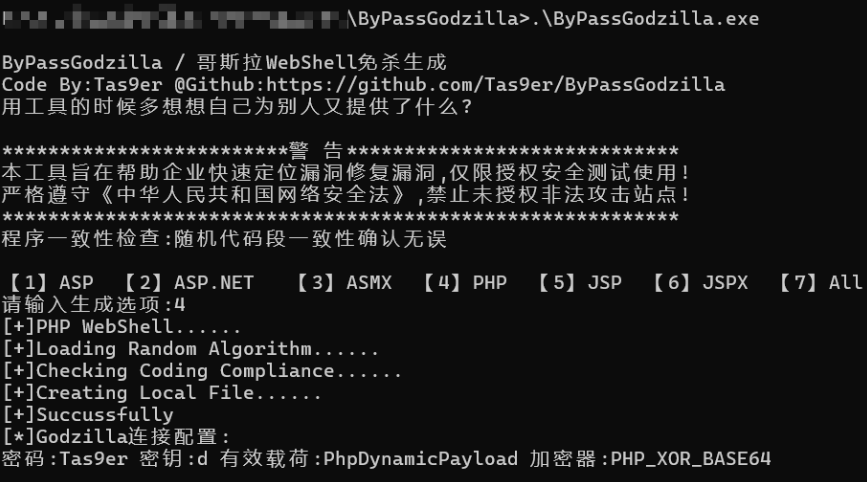 普通一句话怎么传都失败,怀疑是被防御干掉了,尝试搞成免杀 WebShell 再上传,使用 ByPassGodzilla 生成
