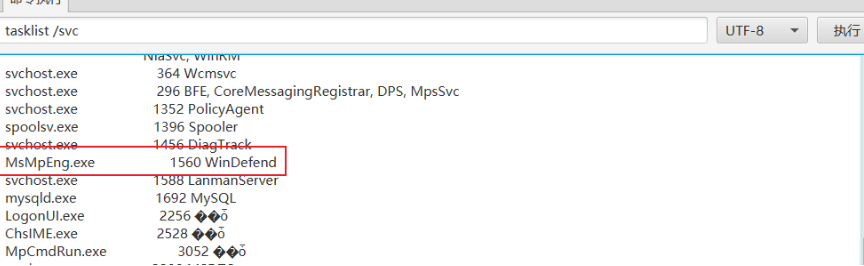 命令执行成功,立刻看一下进程,发现一个 360 和 Defender