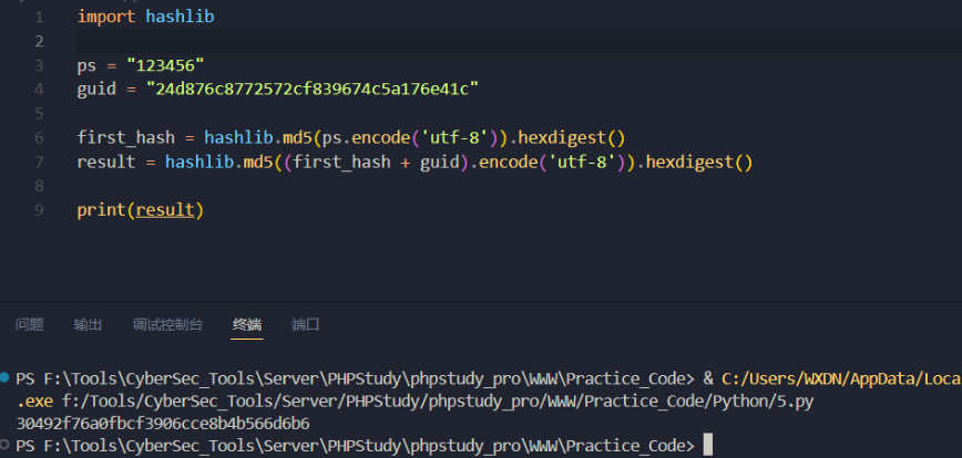 将明文密码 ($ps) 进行 MD5 哈希,接着将哈希值与用户唯一码($guid)拼接,然后对拼接后的字符串再次 MD5 加密,得到最终的哈希值