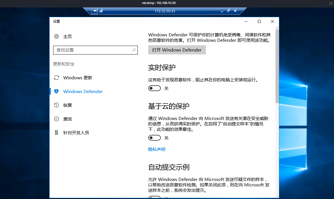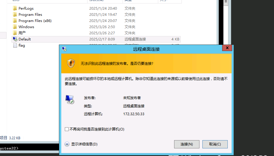 在 192.168.10.65/172.32.50.33 主机 C 盘底下发现了 .rdp 远程桌面配置文件,远程 IP 为 172.32.50.33,是该网段的另一台内网主机,尝试直接连接,显示需要密码。