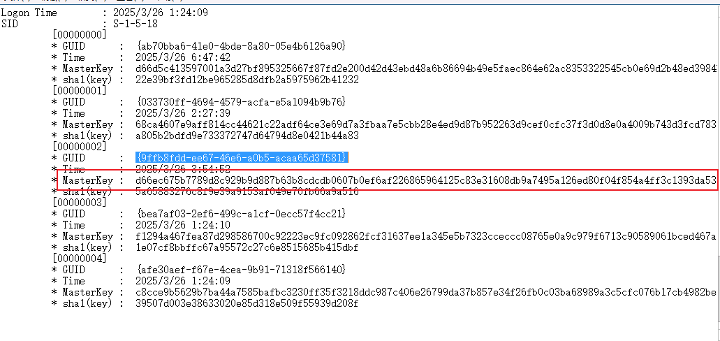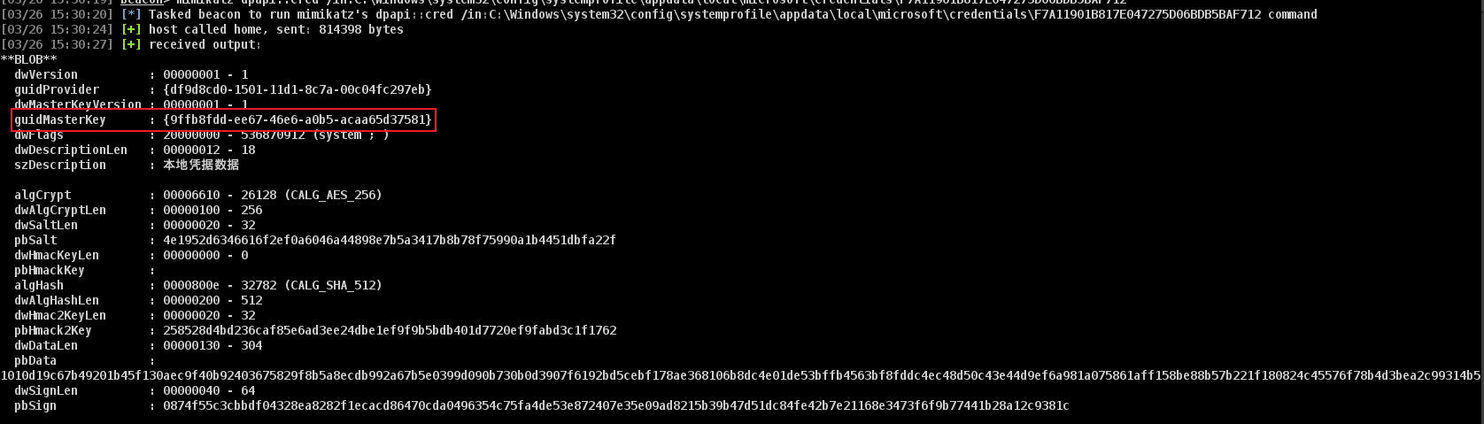 工具选用 mimikatz,对凭证文件进行解密,并记录下guidMasterKey的值