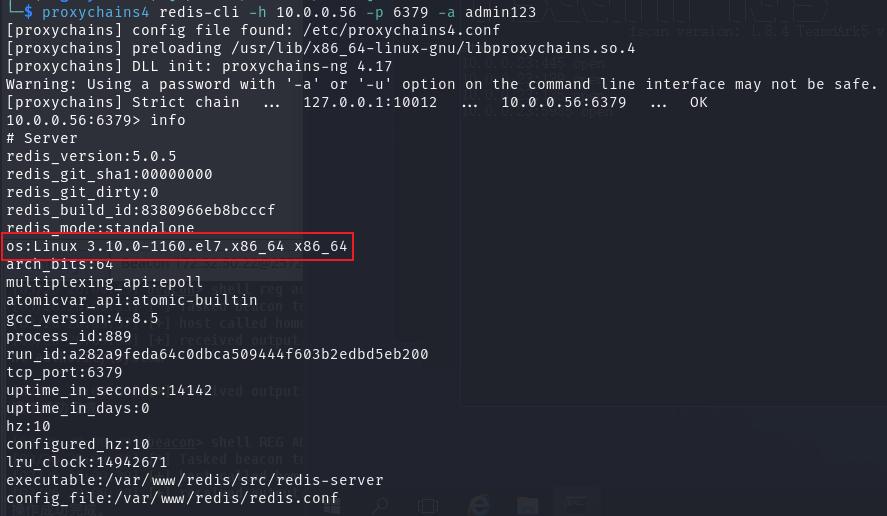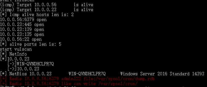 扫描结果显示 10.0.0.56:6379 端口开放,存在未授权访问,密码为 admin123,且对 /var/spool/cron 目录拥有写入权限,这是一个用于存储定时计划任务文件的目录