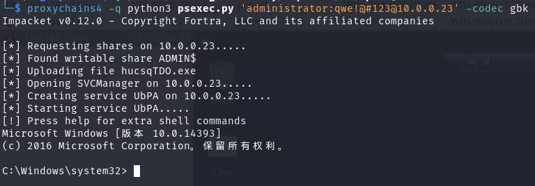 1 | proxychains4 -q python3 psexec.py 'administrator:qwe!@#123@10.0.0.23' -codec gbk |