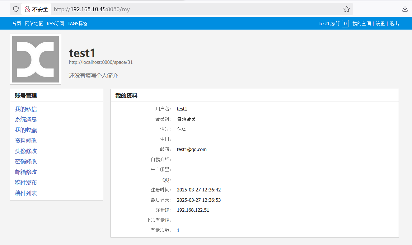 尝试弱口令无果,转向测试历史漏洞,jspxcms 的历史漏洞应该是蛮多的,找到一个前台文件上传,注册账号 -> 点击设置 -> 稿件发布,可以上传文件