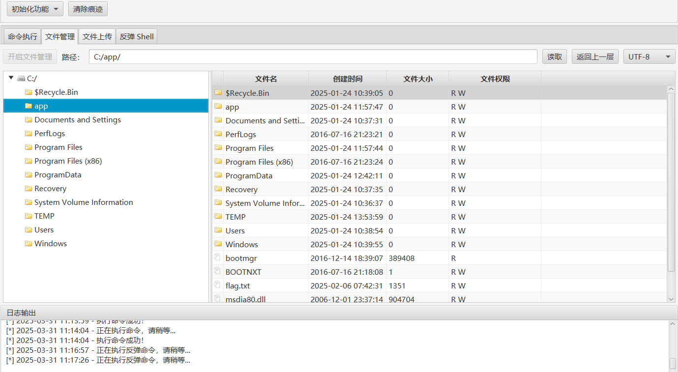 但十分受限,文件功能只能看文件名,无法读取和上传文件,反弹 Shell 也报错