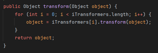 ChainedTransformer chainedTransformer = new ChainedTransformer(transformers); chainedTransformer.transform(null); } }