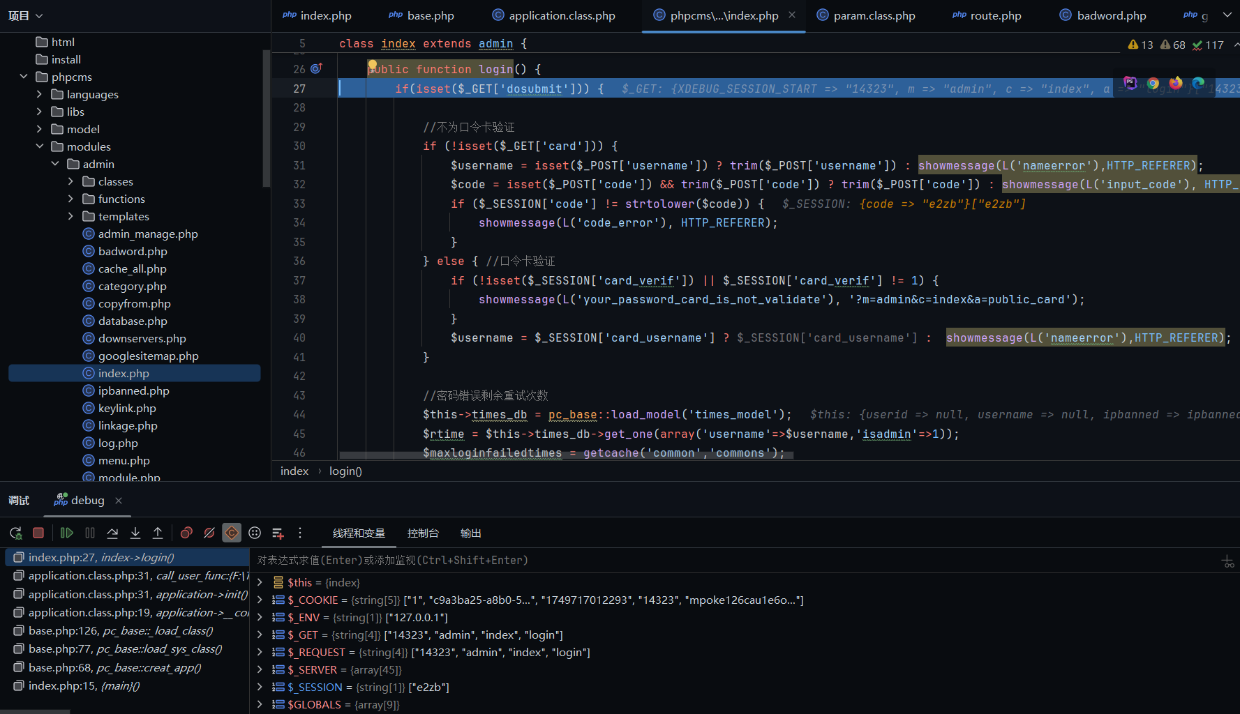这就是 phpcms 的路由机制,假设我们想要访问 phpcms/modules/admin/index.php,即 phpcms 后台,那么则需要如下参数,实际 a=login 仅仅返回前端页面应该不需要,但为了调用内部方法,也加上演示