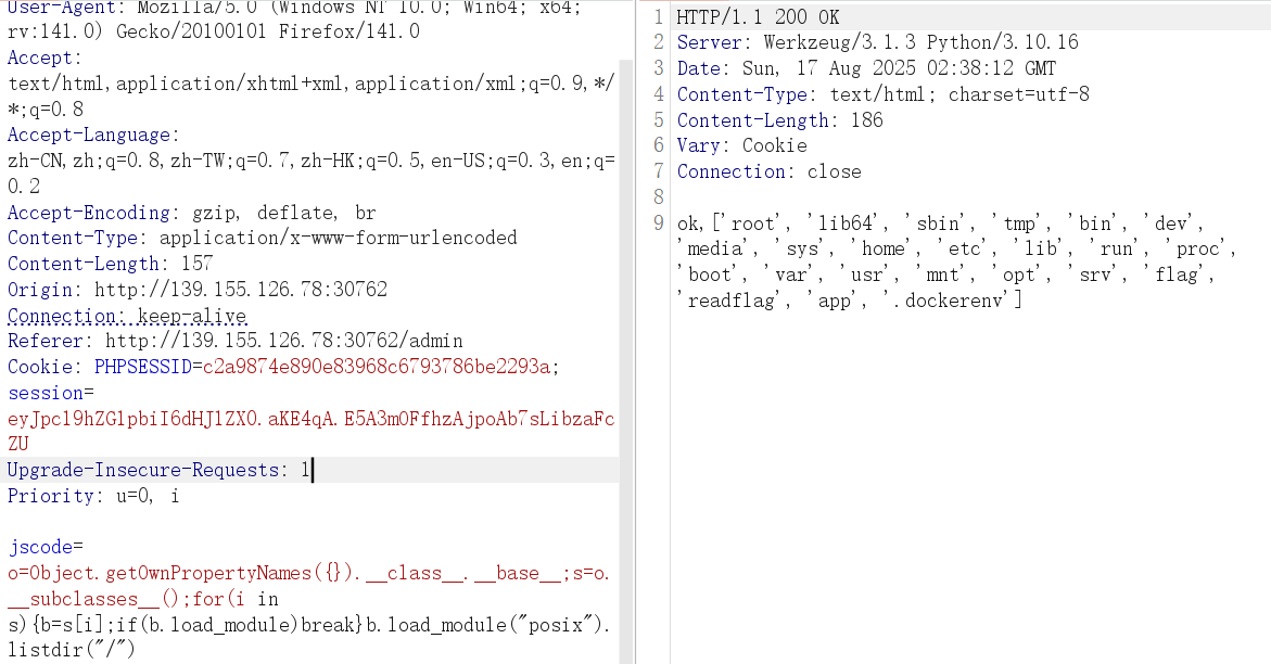 1 2 3 4 5 6 7 8 9 10 11 12 13 14 15 16 @app.route('/admin', methods=['GET', 'POST']) def admin(): if session.get('is_admin'): if request.method == 'POST': js = request.form['jscode'] if len(js) >155: return "too long" try: result=js2py.eval_js(js) return f"ok,{result}" except Exception as e: return f"An error occurred: {str(e)}" else: return render_template('admin.html') else: return redirect(url_for('login'))