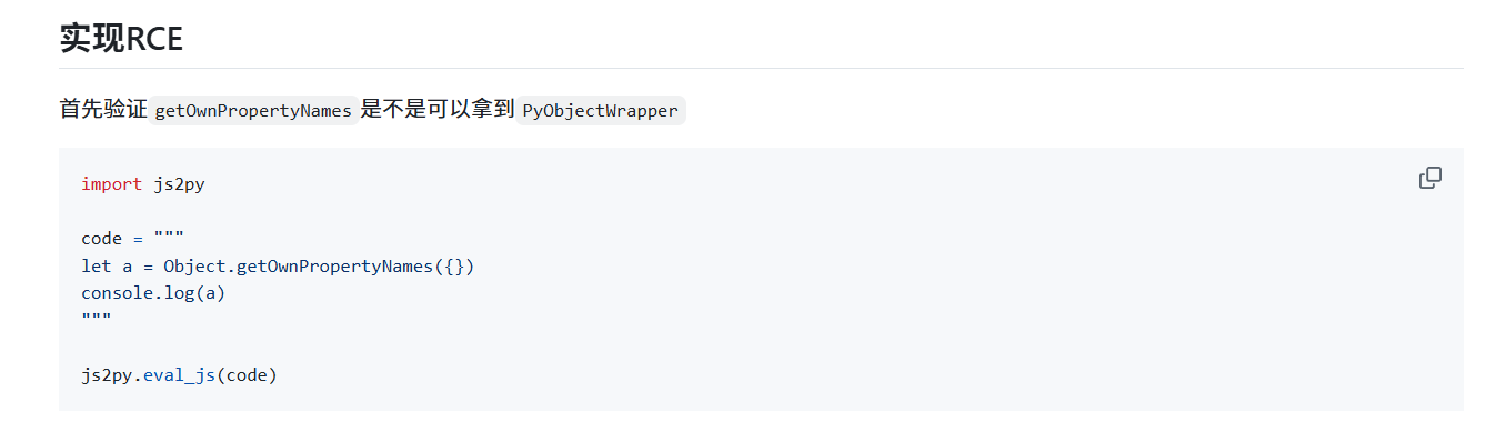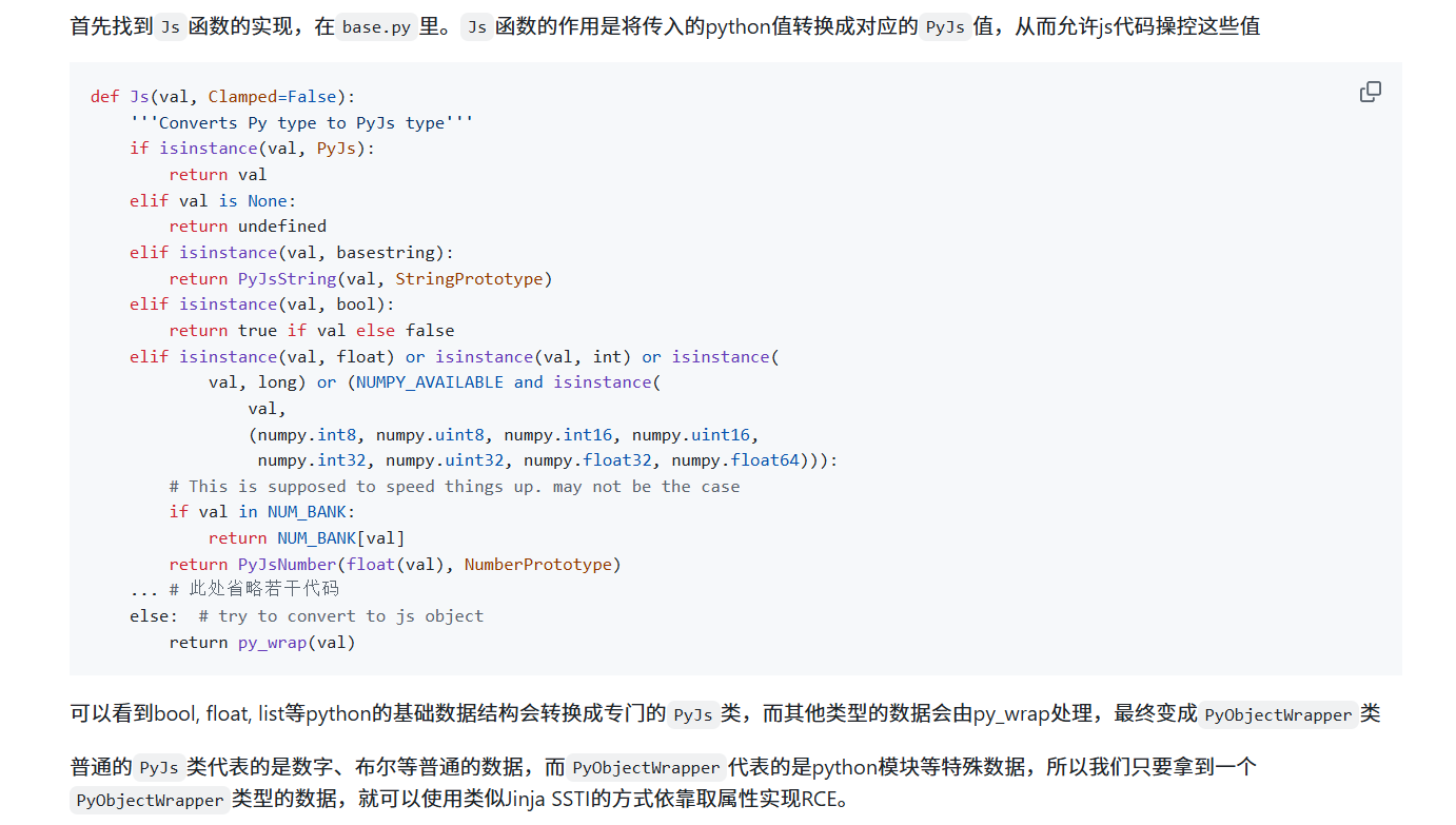 题目最上面定义了 pyjsparser.parser.ENABLE_PYIMPORT = False ,这阻止了显式pyimport语句,不能在用它导入模块 此时在回到最开始的 poc,看看 Marven11 师傅这条利用链是如何实现绕过的