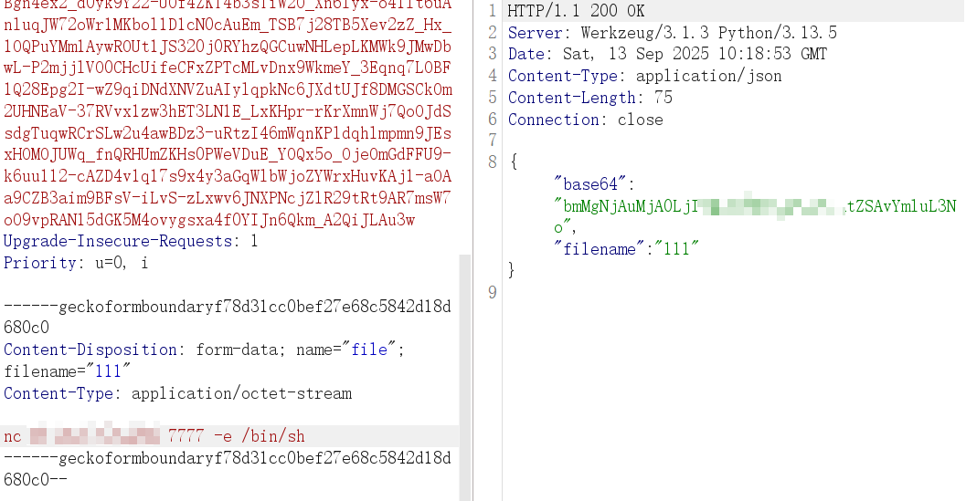 1 2 3 4 5 6 7 8 9 10 11 12 13 14 15 16 17 18 @app.route('/upload', methods=['POST']) def upload_file(): if 'file' not in request.files: return jsonify({"error": "No file part in the request"}), 400 file = request.files['file'] if file.filename == '': return jsonify({"error": "No file selected"}), 400 if(checkname(file.filename)==False): return jsonify({"error": "Not hacking!"}), 500 if file: file_path = os.path.join(app.config['UPLOAD_FOLDER'], file.filename) file.save(file_path) result = subprocess.run(f"cat {file_path} | base64", shell=True, capture_output=True, text=True) encoded_string = result.stdout.strip() return jsonify({ "filename": file.filename, "base64": encoded_string })