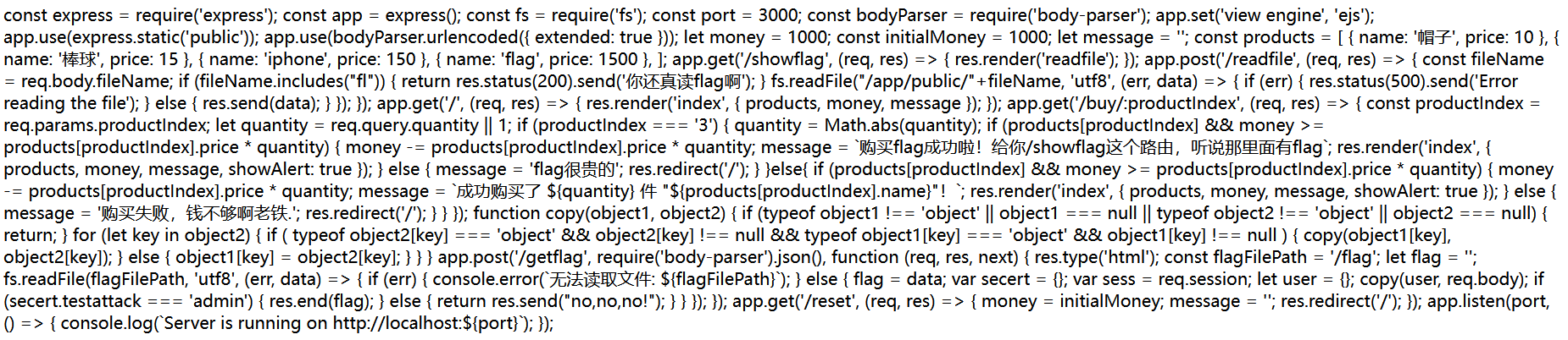 1 2 3 4 5 6 7 8 9 10 11 12 13 14 15 16 17 18 19 20 21 22 23 24 25 26 27 28 29 30 31 32 33 34 35 36 37 38 39 40 41 42 43 44 45 46 47 48 49 50 51 52 53 54 55 56 57 58 59 60 61 62 63 64 65 66 67 68 69 70 71 72 73 74 75 76 77 78 79 80 81 82 83 84 85 86 87 88 89 90 91 92 93 94 95 96 97 98 99 100 101 102 103 104 105 106 107 108 109 110 111 112 113 114 115 116 117 118 119 120 121 122 123 124 125 126 127 128 129 const express = require('express'); const app = express(); const fs = require('fs'); const port = 3000; const bodyParser = require('body-parser'); app.set('view engine', 'ejs'); app.use(express.static('public')); app.use(bodyParser.urlencoded({ extended: true })); let money = 1000; const initialMoney = 1000; let message = ''; const products = [ { name: '帽子', price: 10 }, { name: '棒球', price: 15 }, { name: 'iphone', price: 150 }, { name: 'flag', price: 1500 }, ]; app.get('/showflag', (req, res) => { res.render('readfile'); }); app.post('/readfile', (req, res) => { const fileName = req.body.fileName; if (fileName.includes("fl")) { return res.status(200).send('你还真读flag啊'); } fs.readFile("/app/public/"+fileName, 'utf8', (err, data) => { if (err) { res.status(500).send('Error reading the file'); } else { res.send(data); } }); }); app.get('/', (req, res) => { res.render('index', { products, money, message }); }); app.get('/buy/:productIndex', (req, res) => { const productIndex = req.params.productIndex; let quantity = req.query.quantity || 1; if (productIndex === '3') { quantity = Math.abs(quantity); if (products[productIndex] && money >= products[productIndex].price * quantity) { money -= products[productIndex].price * quantity; message = `购买flag成功啦!给你/showflag这个路由,听说那里面有flag`; res.render('index', { products, money, message, showAlert: true }); } else { message = 'flag很贵的'; res.redirect('/'); } }else{ if (products[productIndex] && money >= products[productIndex].price * quantity) { money -= products[productIndex].price * quantity; message = `成功购买了 ${quantity} 件 "${products[productIndex].name}"!`; res.render('index', { products, money, message, showAlert: true }); } else { message = '购买失败,钱不够啊老铁.'; res.redirect('/'); } } }); function copy(object1, object2) { if (typeof object1 !== 'object' || object1 === null || typeof object2 !== 'object' || object2 === null) { return; } for (let key in object2) { if ( typeof object2[key] === 'object' && object2[key] !== null && typeof object1[key] === 'object' && object1[key] !== null ) { copy(object1[key], object2[key]); } else { object1[key] = object2[key]; } } } app.post('/getflag', require('body-parser').json(), function (req, res, next) { res.type('html'); const flagFilePath = '/flag'; let flag = ''; fs.readFile(flagFilePath, 'utf8', (err, data) => { if (err) { console.error(`无法读取文件: ${flagFilePath}`); } else { flag = data; var secert = {}; var sess = req.session; let user = {}; copy(user, req.body); if (secert.testattack === 'admin') { res.end(flag); } else { return res.send("no,no,no!"); } } }); }); app.get('/reset', (req, res) => { money = initialMoney; message = ''; res.redirect('/'); }); app.listen(port, () => { console.log(`Server is running on http://localhost:${port}`); });
