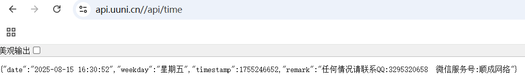 1 2 # {"date":"2080-08-15 16:30:52","weekday":"星期五","timestamp":1755246652,"remark":"任何情况请联系QQ:3295320658 微信服务号:顺成网络"} python3 -m http.server 29999