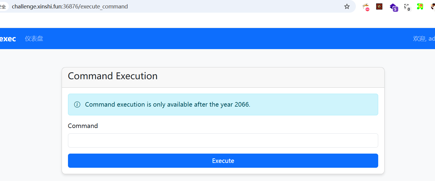 1 2 3 4 5 6 7 8 9 10 11 12 13 14 15 16 17 18 19 20 21 22 23 24 25 @app.route('/execute_command', methods=['GET', 'POST']) @login_required def execute_command(): result = check_time_api() => def check_time_api(): user = User.query.get(session['user_id']) try: response = requests.get(user.time_api) data = response.json() datetime_str = data.get('date') if datetime_str: print(datetime_str) current_time = datetime.fromisoformat(datetime_str) return current_time.year >= 2066 except Exception as e: return None return None if result is None: if not result: if request.method == 'POST': os.system(command) ... return render_template('execute_command.html')