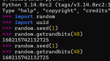 先看一下 uuid8 方法怎么实现的。 如果参数没有定义,则 a、b、c 参数都由 random.getrandbits() 生成,这里用的是 random 模块的 PRNG,会被 random.seed() 全局播种影响;随后进行位拼装得到字符串