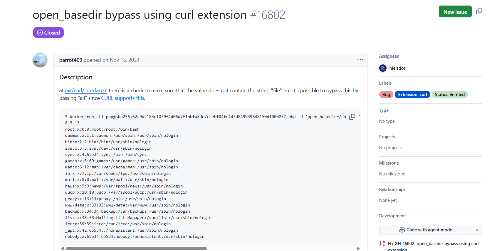 在正常情况下,curl 的 file:// 协议是受到 open_basedir 限制的,这意味着如果 open_basedir 被设置为限制访问的路径,file:// 协议会被阻止。 但curl 扩展允许通过 CURLOPT_PROTOCOLS_STR 选项来显式指定允许使用的协议,并将其设置为 all。这意味着可以让 curl 支持所有协议,包括 file:// 协议,即使该协议在 PHP 配置中通常会受到限制。