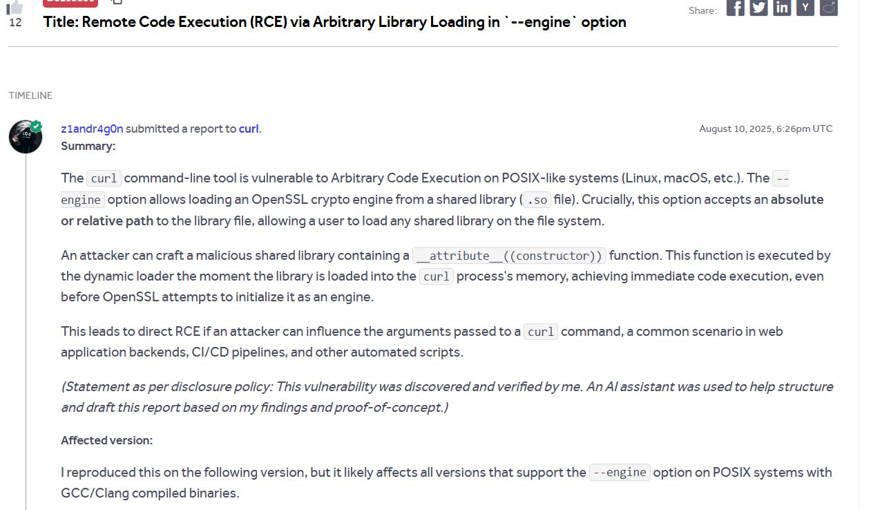 发现 curl 加载动态库链接的缺陷,能够导致 RCEhttps://hackerone.com/reports/3293801